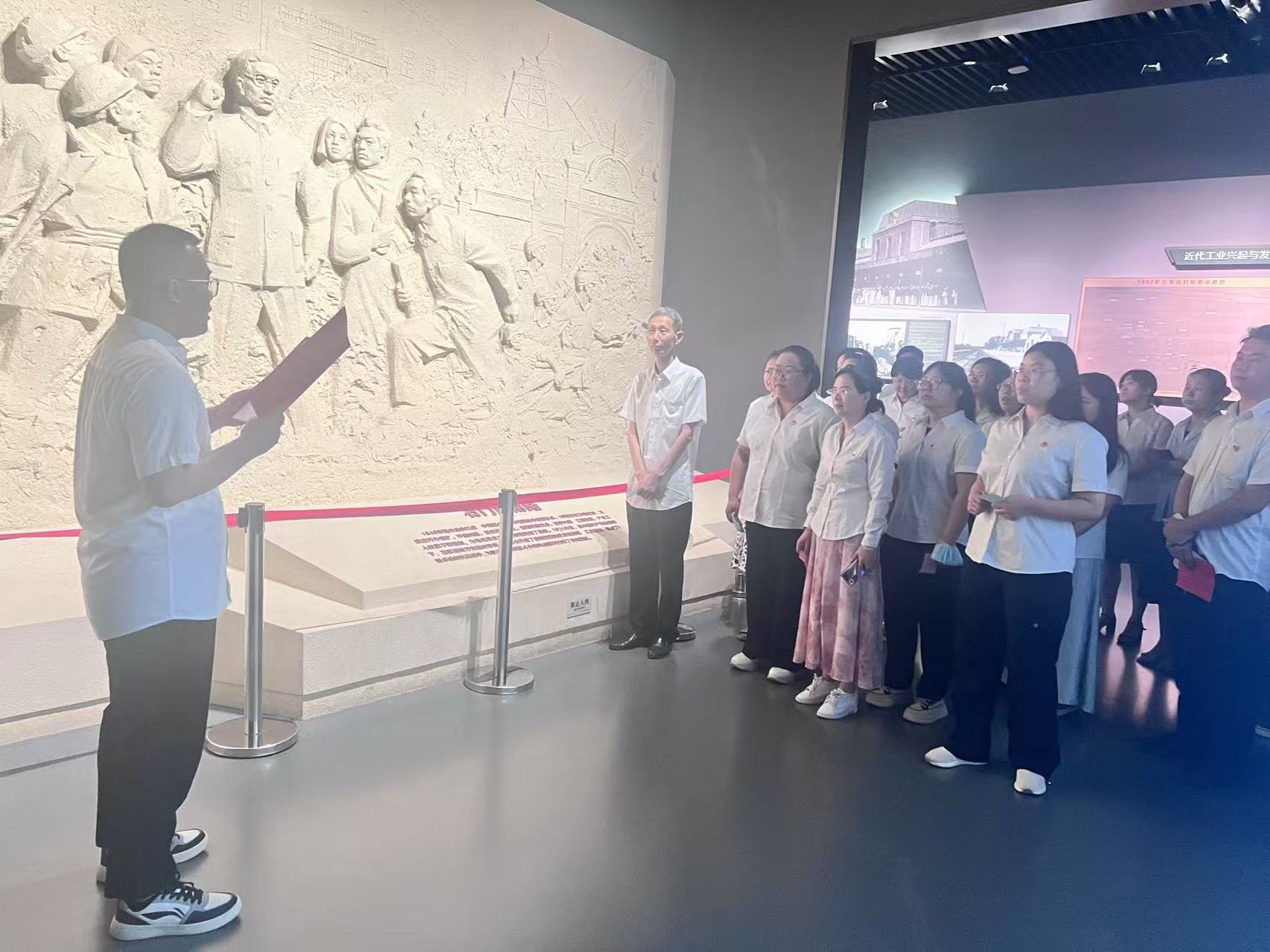 随后,大家走进纪念馆展厅,依次参观“石门风雨”“解放石门”“辉煌历程”三大主题展区。通过200余件珍贵文物、历史照片、动态沙盘及多媒体影像,党员们深入了解了石家庄(曾称“石门”)在抗日战争和解放战争中的战略地位,以及1947年晋察冀野战军攻克石门的历史意义。
